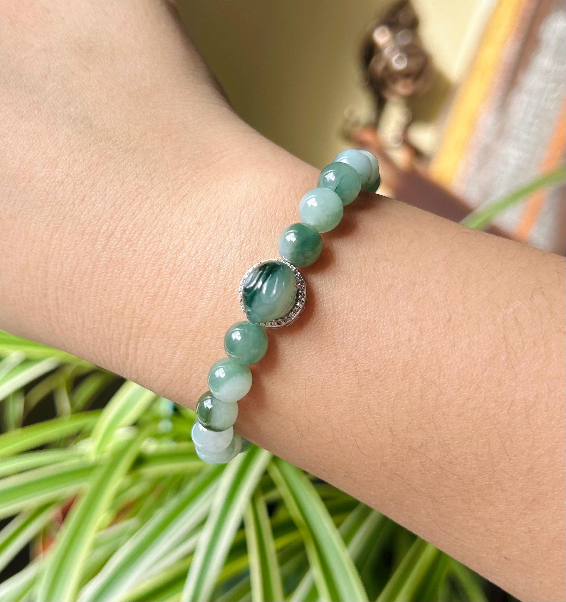 Our latest offering is a brand-new "A" graded natural Burmese Jadeite beaded bracelet, featuring a stunning icy half green half white natural Burmese round beads. Each bead is over 7.7-8mm in diameter, showcasing icy translucent clarity, a fine, smooth, and even texture, and outstanding luster. The focal piece is a hand carved Jadeite rabbit Charm. These beads are meticulously matched in size, color, and quality. Rest assured, all the materials used are 100% grade A natural Jadeite without any treatment. The bracelet is elegantly strung on a clear, stretchy cord and measures approximately 6.5” in length when unstretched and is adjustable upon request. For more details and measurements, please refer to the accompanying images and feel free to contact us for more info.