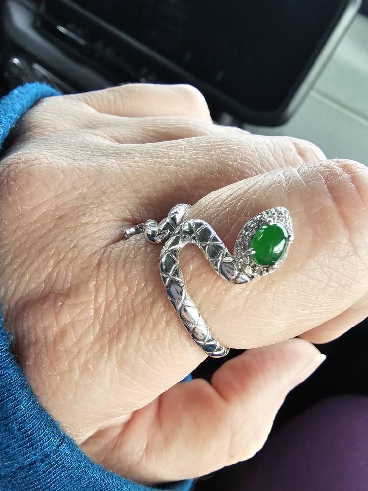 Our latest offering is a brand-new "A" graded natural Guatemalan Jadeite with 925 sterling silver snake Ring, featuring a stunning natural icy green color, showcasing highly icy translucent clarity, a fine, smooth, and even texture, and outstanding luster. the ring is adjustable in size, and fits well with any size. Rest assured, all the materials used are 100% grade A natural Jadeite without any treatment.
