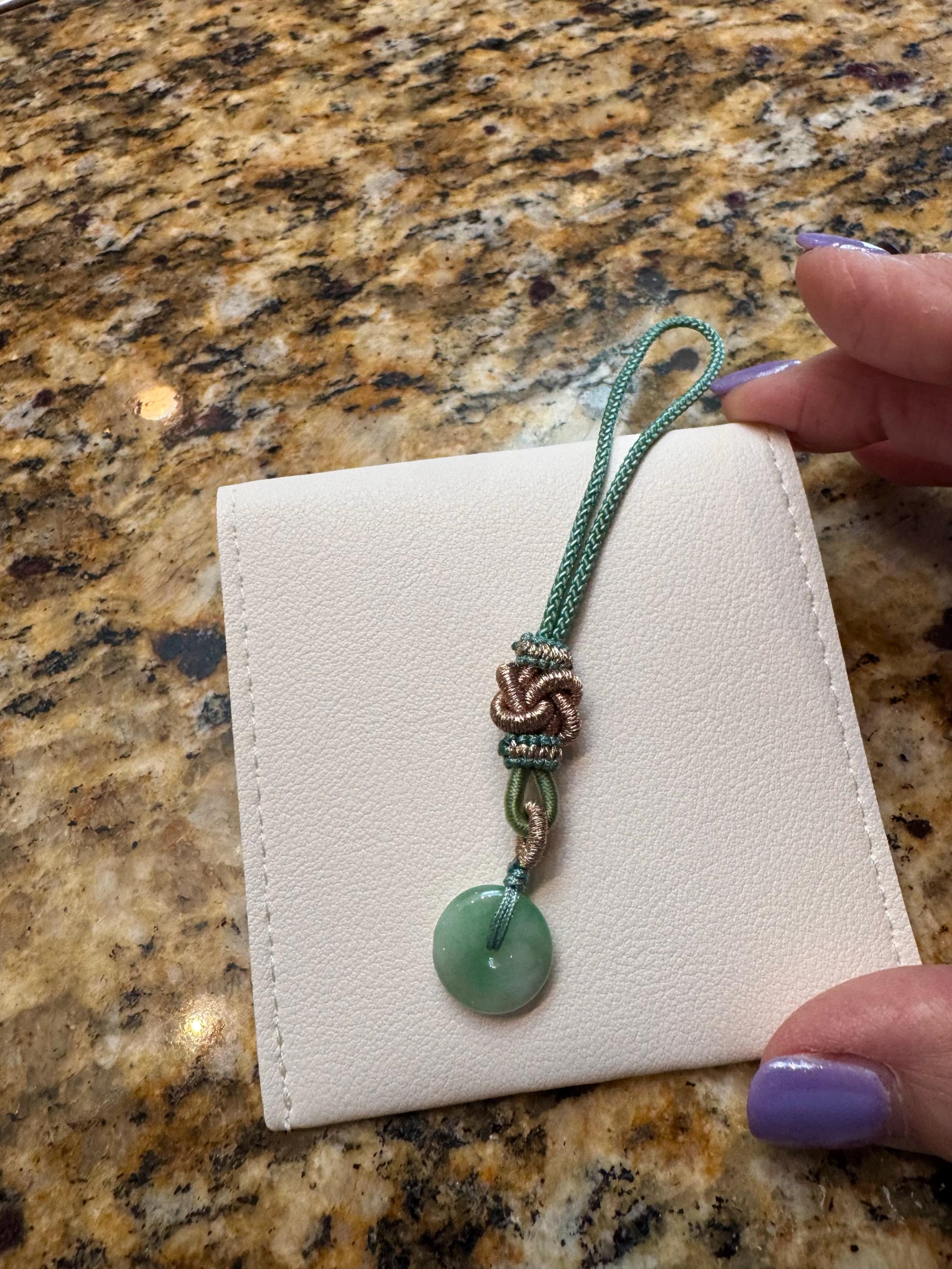 Our latest offering is a brand-new "A" graded natural Burmese Jadeite hand-carved lucky donut(Ping-An-Kou 平安扣) phone charm, featuring a stunning natural icy color, showcasing icy translucent clarity, a fine, smooth, and even texture, and outstanding luster. the charm is over 13 in diameter and 3.5mm in thickness. Rest assured, all the materials used are 100% grade A natural Jadeite without any treatment.