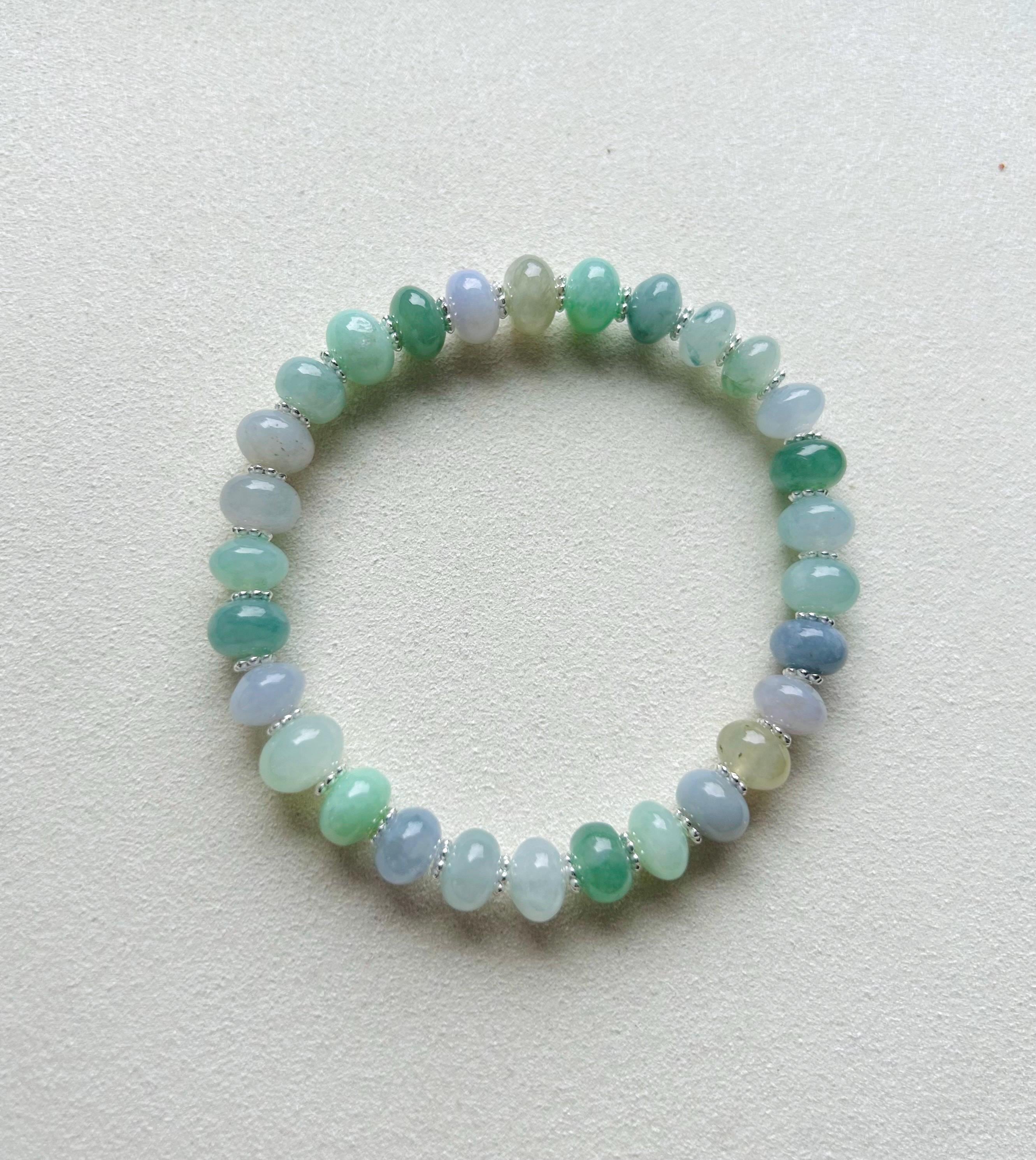 Our latest offering is a brand-new "A" graded natural Burmese Jadeite Beaded bracelet, featuring a stunning icy light multi-color, showcasing icy translucent clarity, a fine, smooth, and even texture, and outstanding luster. Each bead is over 8mm in diameter. The jade beads are meticulously matched in size, color, and quality. Rest assured, all the materials used are 100% grade A natural Jadeite without any treatment. The bracelet is 17cm in length when relaxed . For more details and measurements, please refer to the accompanying images and feel free to contact us for more info or adjustment requests.