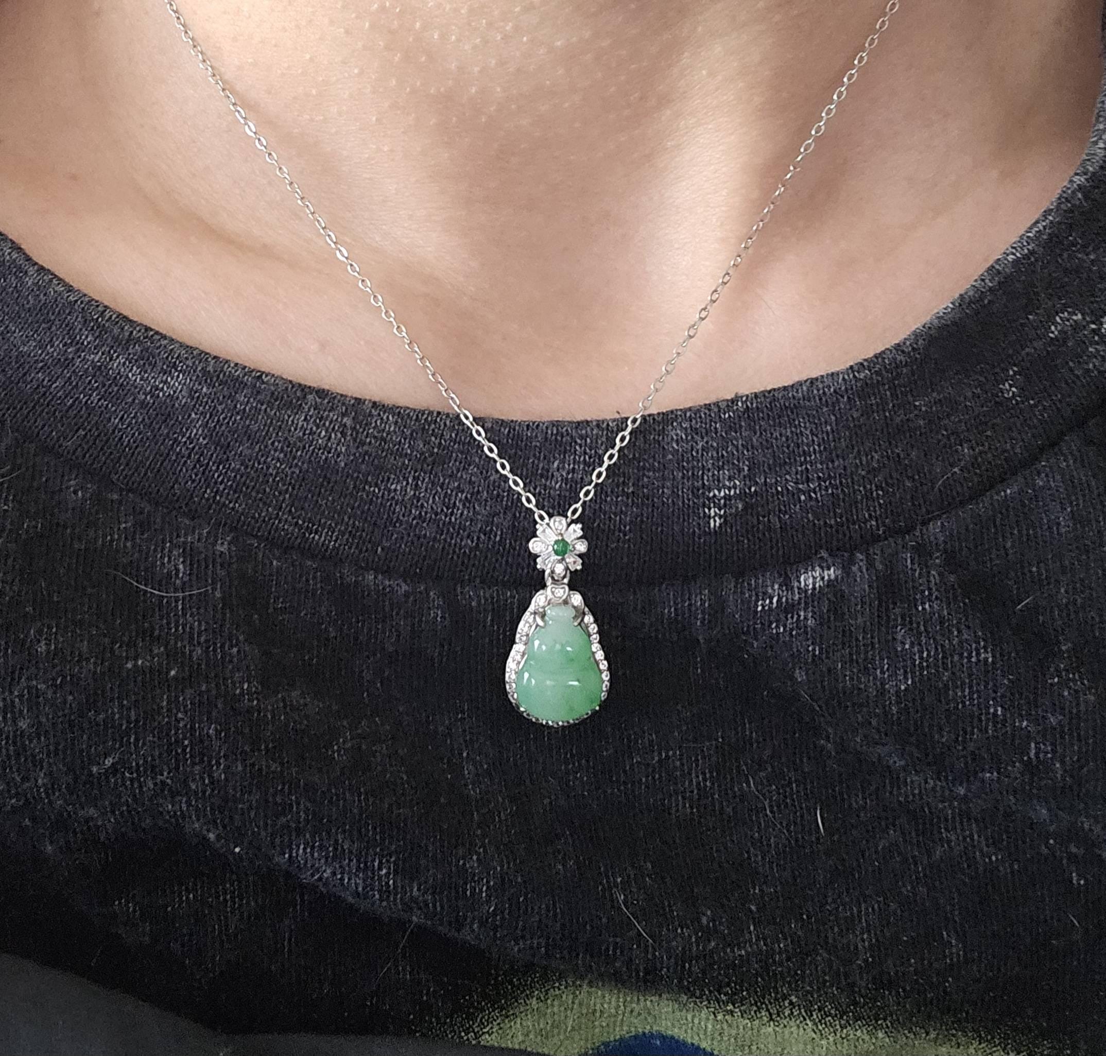 Our latest offering is a brand-new "A" graded highly translucent natural Burmese icy green Jadeite Hulu Pendant jewelry with Sterling Silver bail. The pendent is featuring a stunning natural smooth sweet Sunny green color, showcasing a fine, smooth, and even texture, and outstanding luster. Rest assured, all the materials used are 100% grade A natural Jadeite without any treatment. Associated gift chain is made from 925 sterling silver with 18k gold filled.